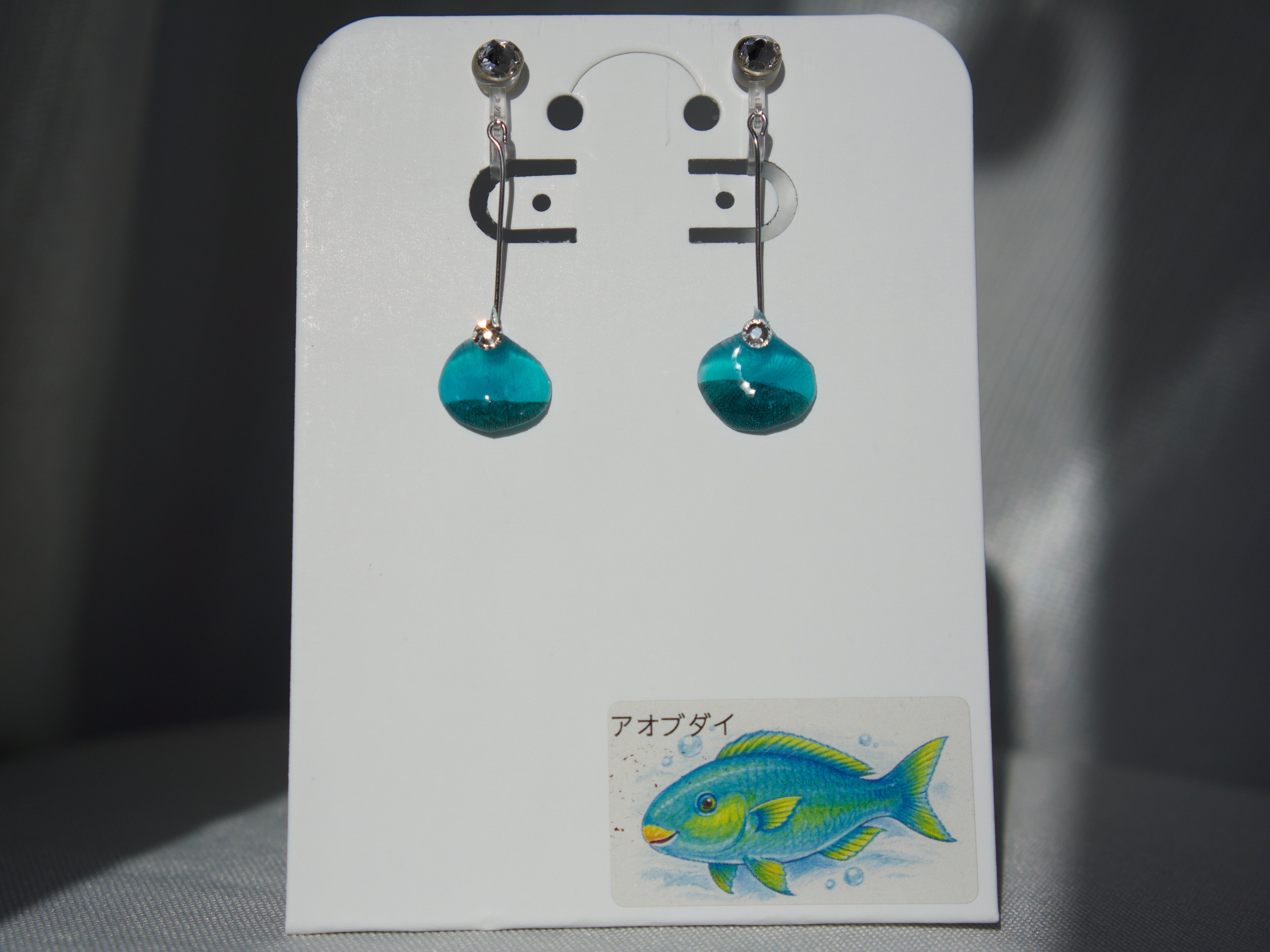 今回は「アオブダイ」という魚の美しい鱗を使用したイヤリングです。